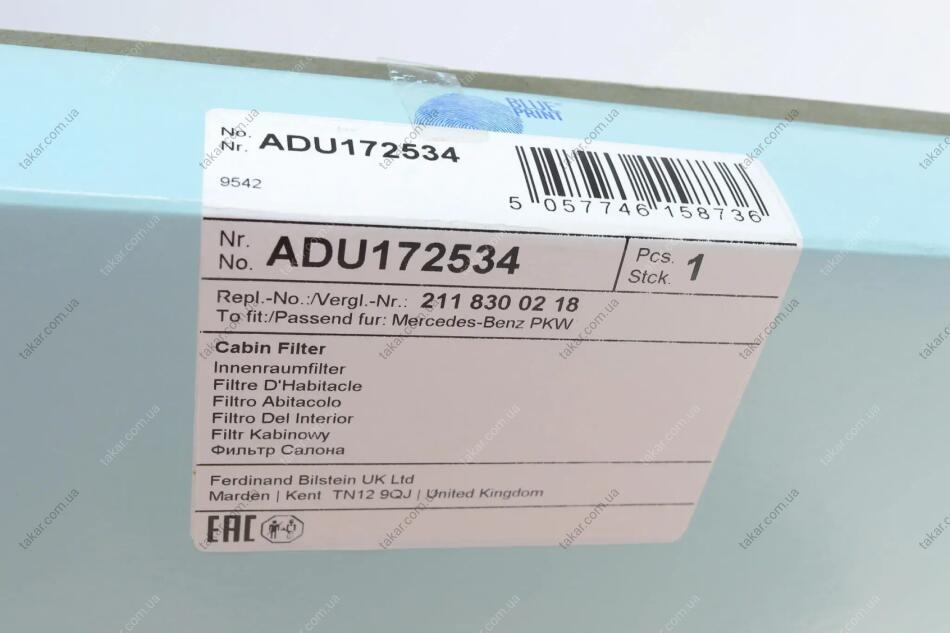 Змінний фільтруючий елемент повітряного фільтра салону BLUE PRINT ADU172534