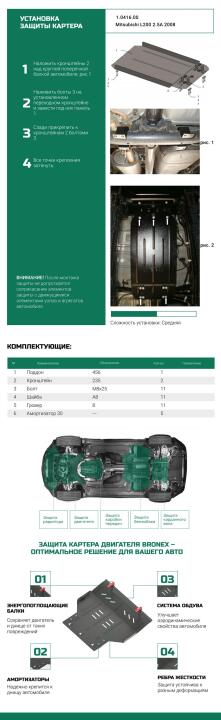 Захист роздатки Mitsubishi L200 (матеріал серії Standard) виготовляється з холоднокатаної сталі товщиною 2,5 мм і покривається полімерною порошковою фарбою, яка запобігає руйнуванню металу після впливу вологи та інших чинників, що спричиняють корозію. Піддон закриває роздатка автомобіля від пошкоджень в результаті їзди нерівними ділянками дороги і потрапляння під капот води і сторонніх предметів.