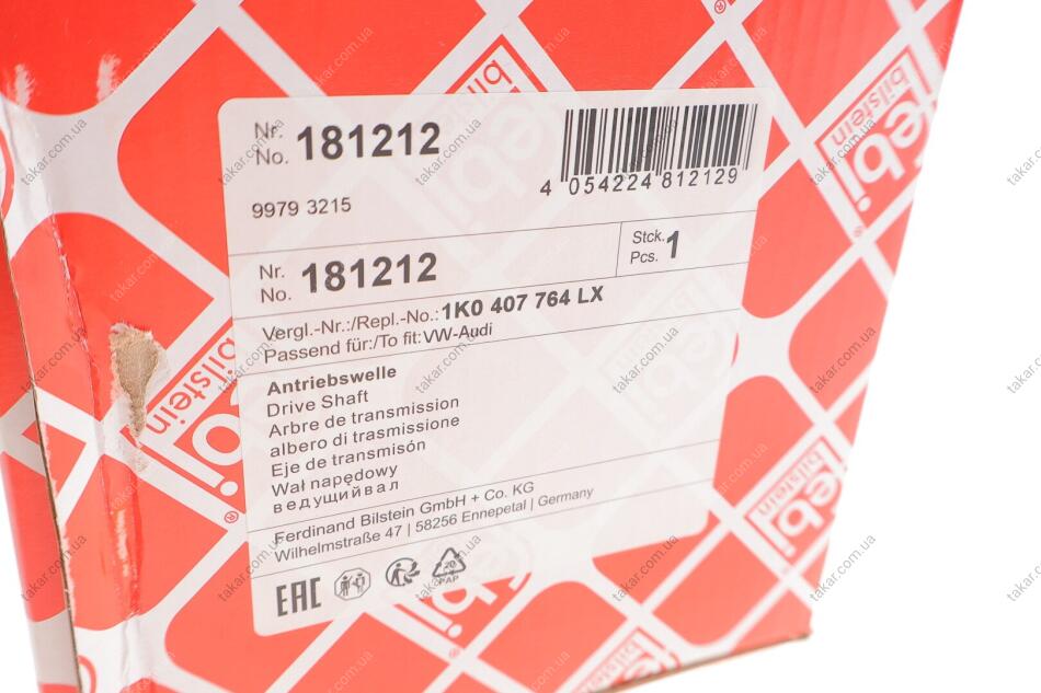 Вал приводний AUDI A3, Q3, SKODA OCTAVIA II, OCTAVIA III, SUPERB II, VW CADDY III (FEBI) FEBI BILSTEIN 181212
