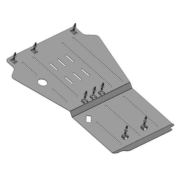 Изготовленная из высококачественной оцинкованной стали холодного проката (материал Premium) защита двигателя, КПП Nissan Navara 2005-2014 обладает необходимыми качествами, чтобы предотвратить незапланированные внешние нагрузки. Поддон надежно заслоняет от повреждений, возникающих во время движения по неровным дорогам или при наезде на препятствия, двигатель, КПП автомобиля. Чтобы изделие служило долго, металл покрывается особым полимерным напылением, которое предотвращает коррозию на его поверхности после контакта с водой или грязью.