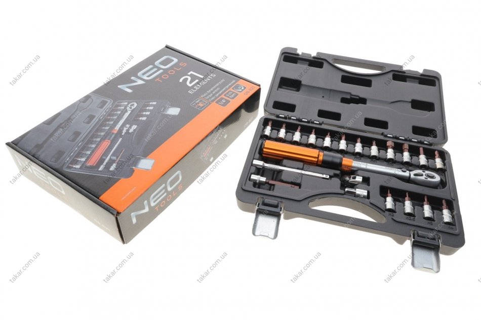 Динамометрический ключ 1/4”, 5-25 Нм, набор из 21 шт.. Neo 08-821
